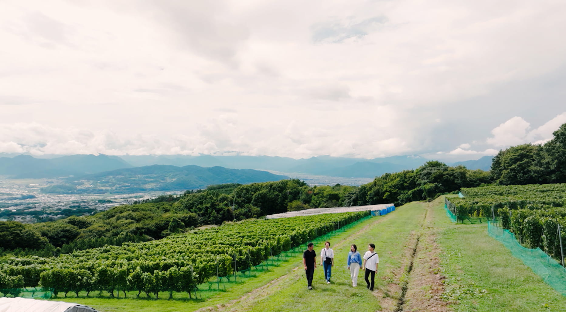 丘の上からは、北アルプスの稜線と葡萄畑が広がる景色を一望。ガイドの解説を通して、造り手の哲学や、栽培から醸造・熟成に至るまでのプロセスを学びながら、畑や風景を通して“テロワール”を体感します。
